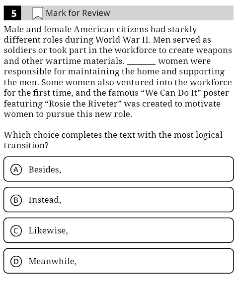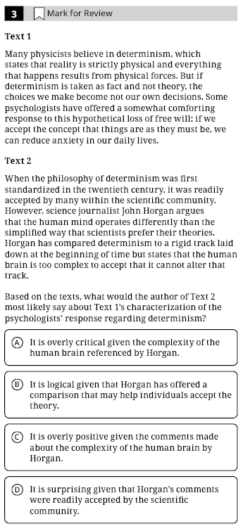 Want a preview of some of the question types on the digital SAT ? Try the SAT sample questions below. Challenge yourself with some reading, writing, and language practice. Try our SAT math practice questions to see if your math skills are up to par or if you still need some SAT math review.