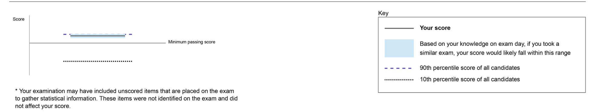 The solid line above shows the total score, and the blue box surrounding it shows the expected range of scores were you to take the exam multiple times. This range accounts for random factors like comfort of exam conditions, lucky vs. unlucky guesswork, etc. The solid line is labeled “Minimum passing score” or MPS. The dotted lines show the 10th percentile (bottom 10%) and 90th percentile (top 10%) scores of the total population of that exam cycle. This report shows an impressive passing score near the 90th percentile.