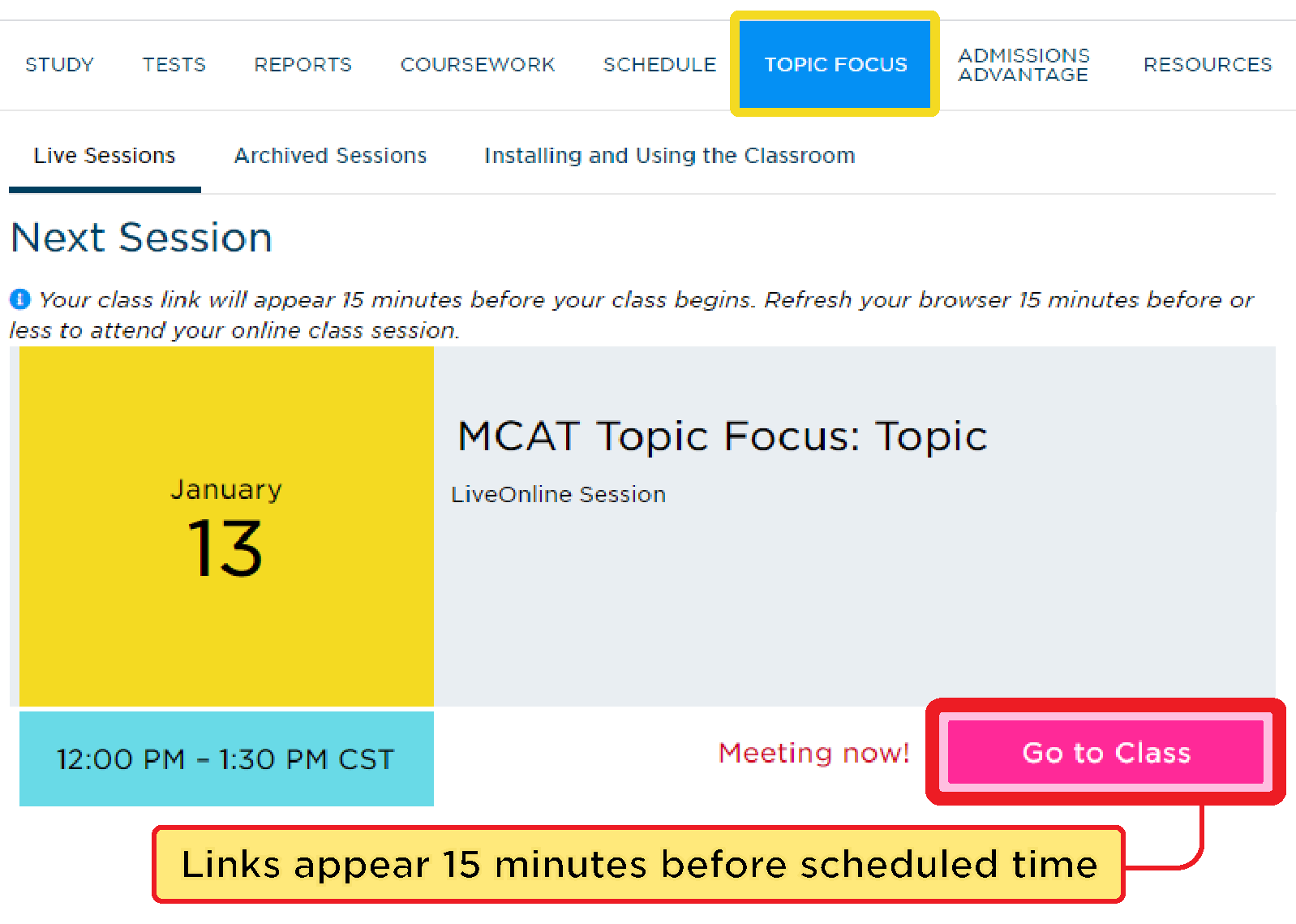 For students enrolled in our 510+ Guarantee courses, our MCAT Topic Focus sessions meet in the same classroom environment as all regularly scheduled Ultimate class sessions. Classroom launch links are available in the ‘Live Sessions’ tab of the ‘Topic Focus’ section of your Student Portal. The link becomes active 15 minutes before the scheduled start time.